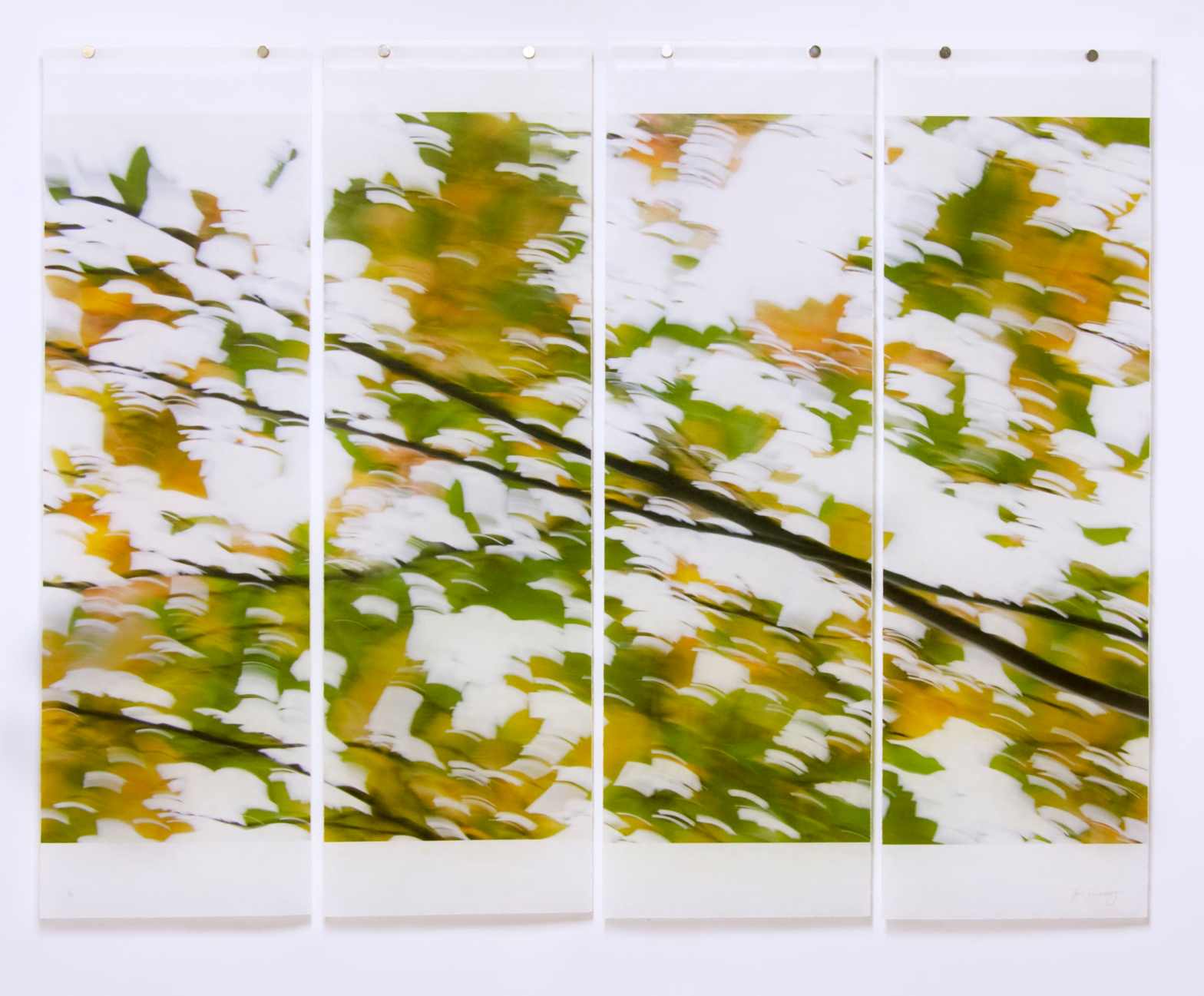 The work of Jeri Eisenberg captures ethereal, fleeting moments in nature. Her photographs are printed on handmade paper, with an encaustic wax medium embedded into the kozo. The combination of modern and ancient techniques is not unharmonious; instead, the pairing is beautiful and delicate. The work flutters off the gallery wall, reminiscent of the movement of leaves in the wind.